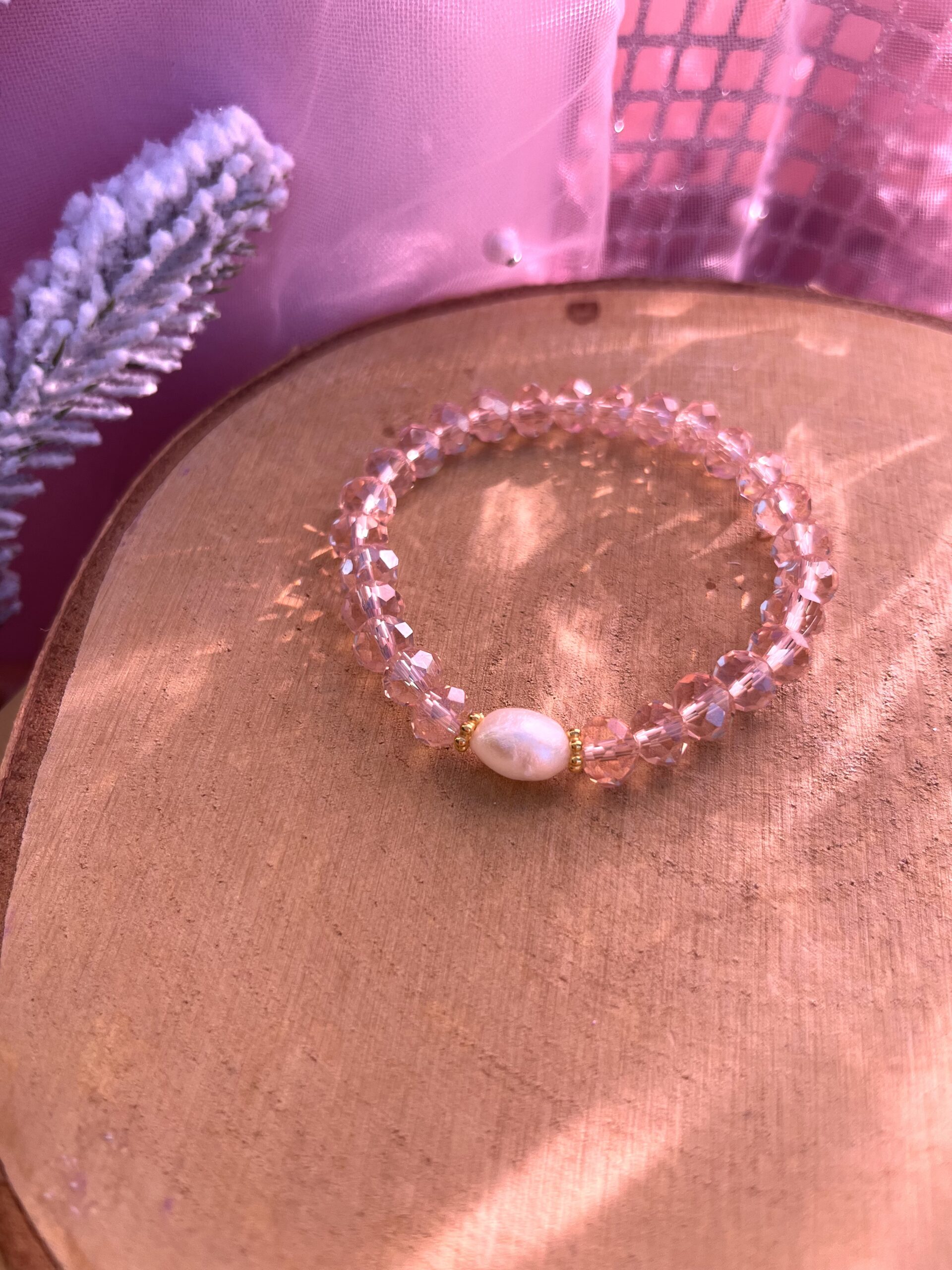 • Bracelet élastique en perles de verre et ornée d’une véritable perle d’eau douce