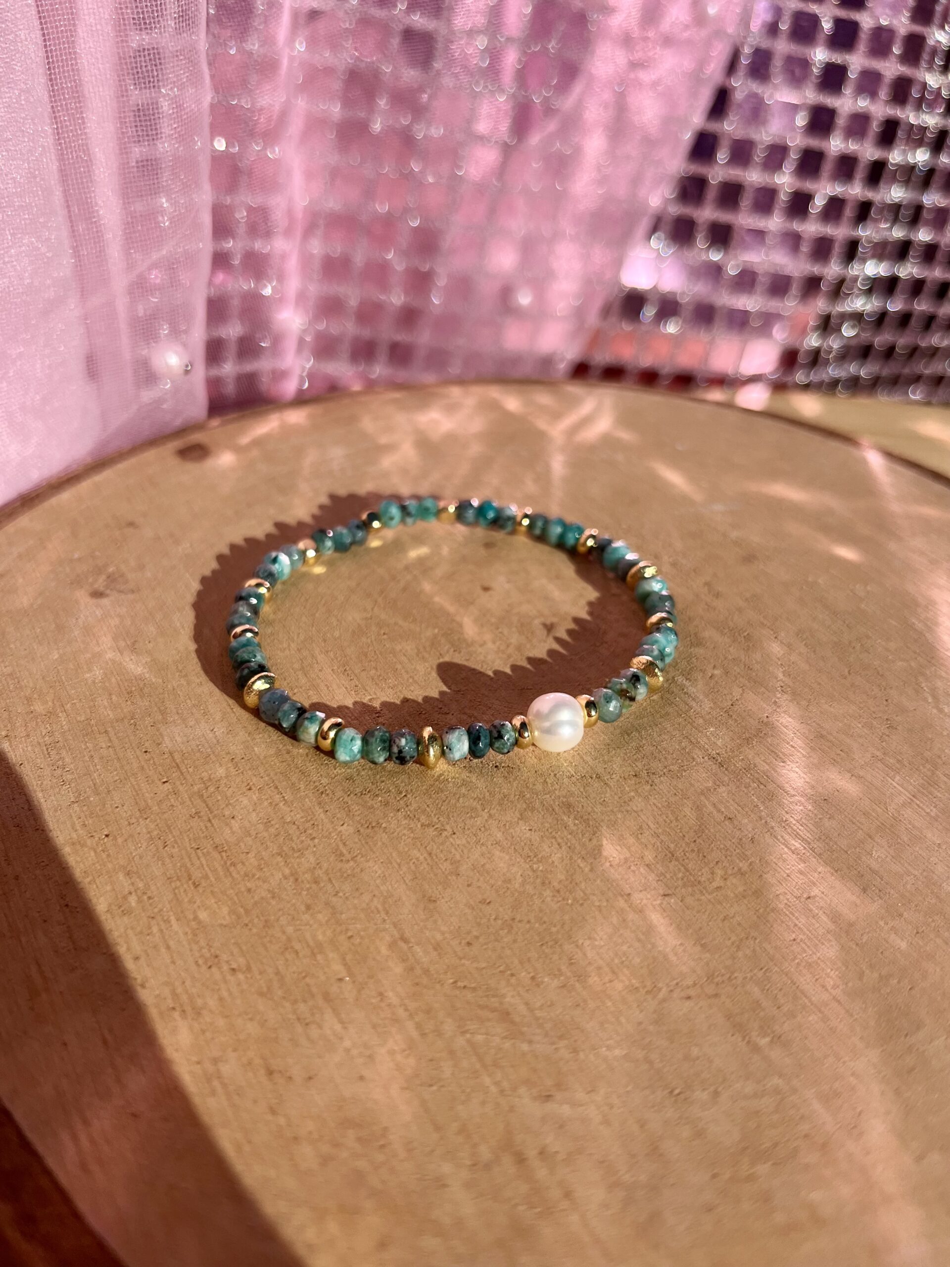 - Bracelet élastique orné de pierres de jade vertes, de perles doré 24k et d’une véritable perle d’eau douce